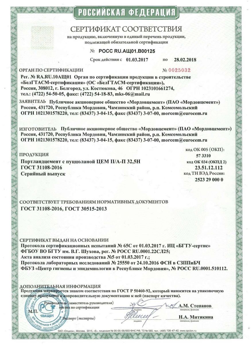 Сертификат соответствия 31108-2016 ЦEM II A-П 42,5 Н 2020-2021 гг.